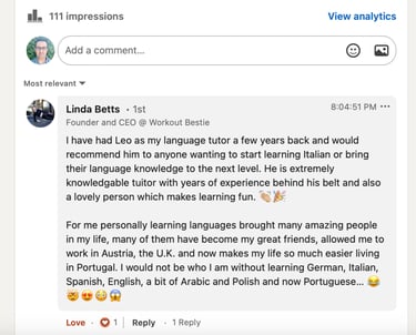 “Language lessons are fun and are supported by Leo’s positive energy. There is a lot of speaking practice and many interesting examples.”